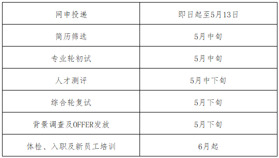 网申→简历筛选→专业轮初试→人才测评→综合轮复试→背景调查→发放OFFER→体检→入职→新员工培训及后续培养