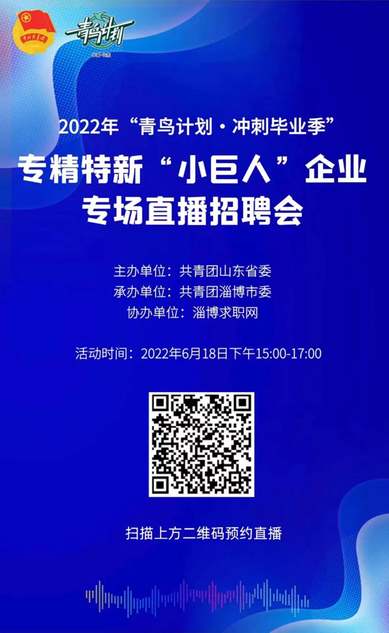 第五场专精特新“小巨人”专场招聘由共青团淄博市委承办,将于2022年6月18日15:00启动。